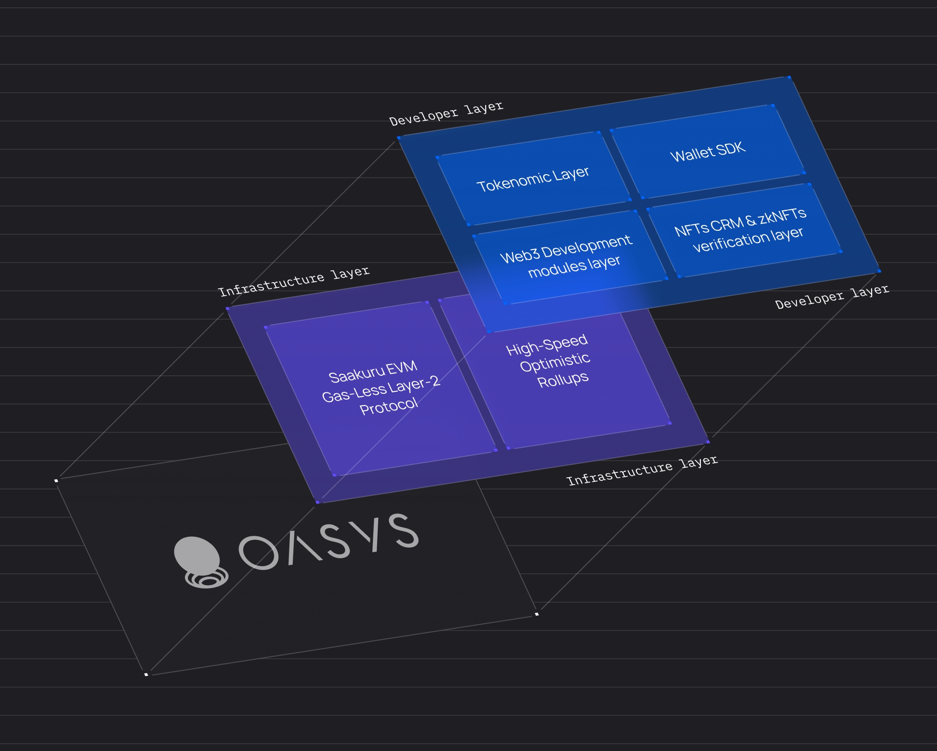 Infrastructure layer: public-permissioned gas-less L2 blockchain powered by Oasys High-Speed Optimistic Rollups. Network design and public-permissioned nature allow the complete removal of gas fees from the user experience and allow the development of decentralized applications without blockers for new users to use their product.