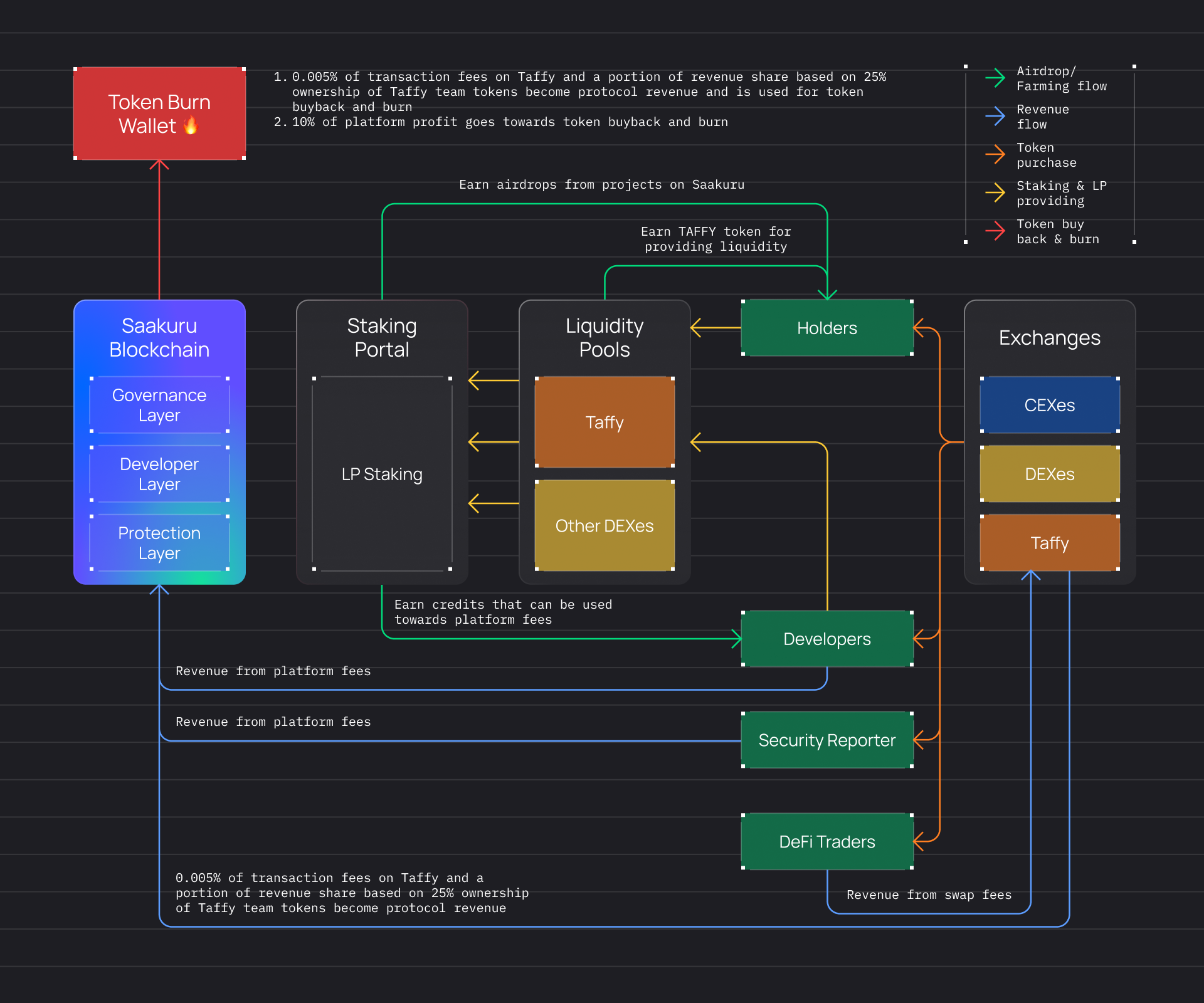 2. [DeFi Layer](https://source.saakuru.com/saakuru-source/saakuru-skr-token/defi-layer) - facilitated by Taffy DEX technology, 0.005% of every fee collected from on-chain and cross-chain transactions throughout the Taffy DEX protocol is converted to SKR tokens and burned.