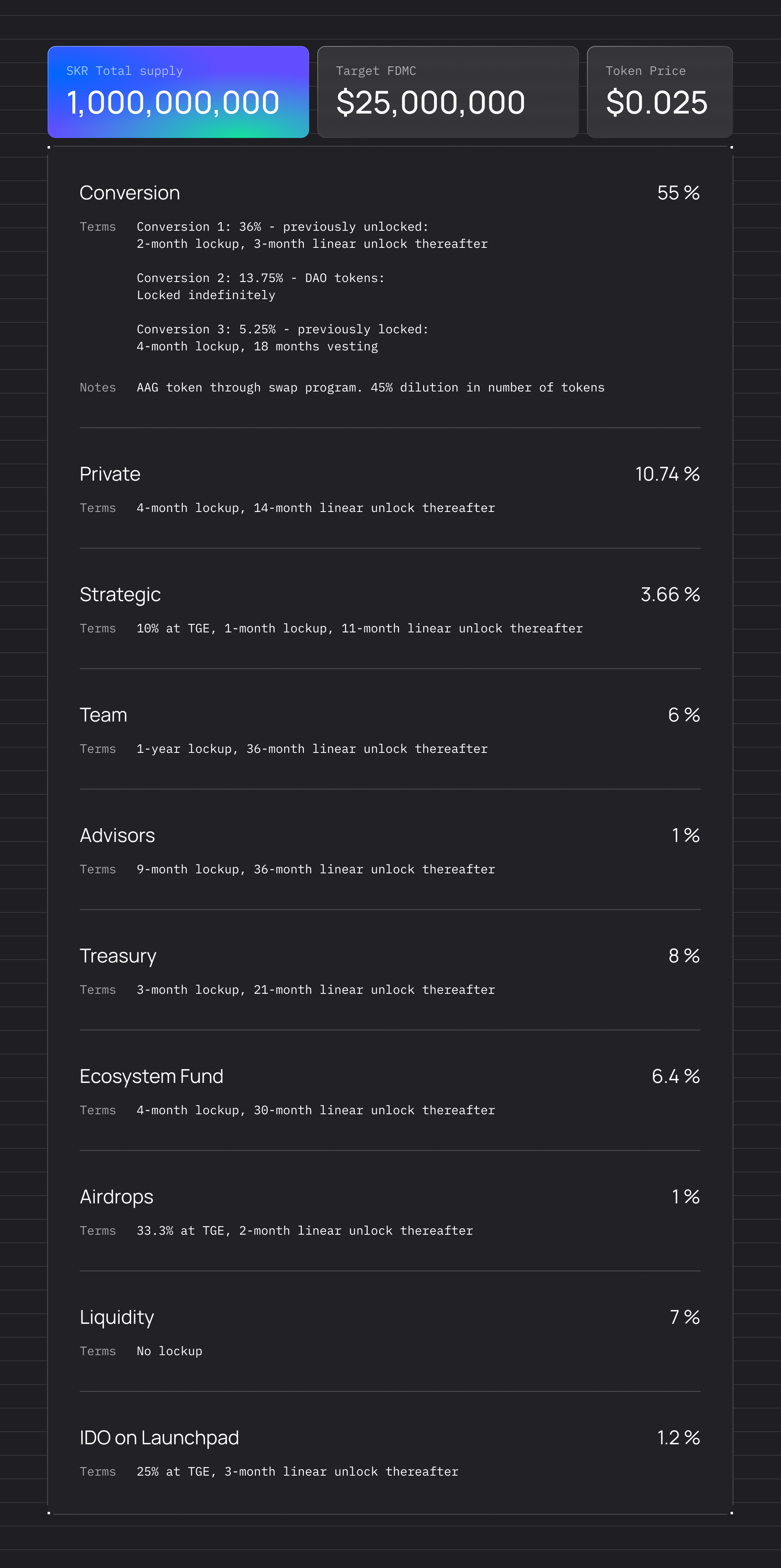 | Total starting supply | 1,000,000,000 SKR                                                                                                                          |